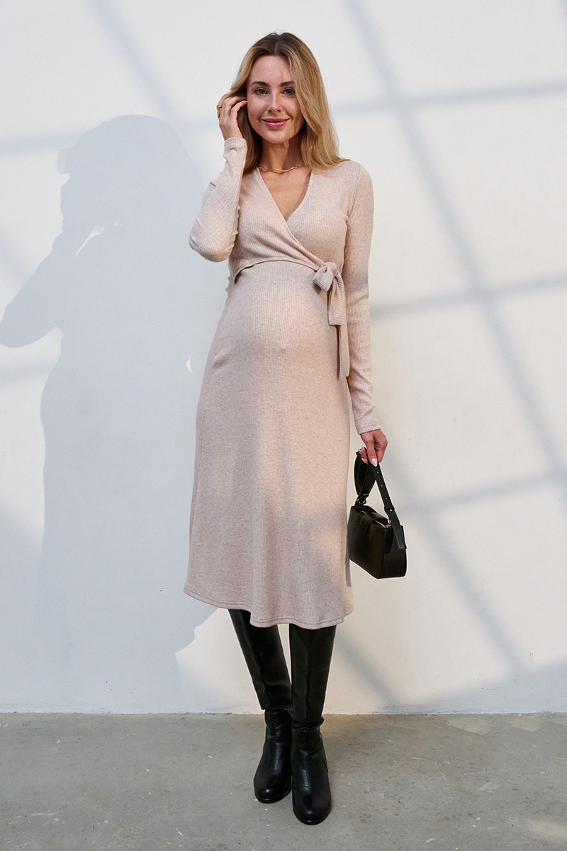 Елегантна сукня для вагітних і годуючих мам з теплого трикотажу в рубчик. Силует: облягаючий ліф і вільна спідниця. Секрет годування: запа х по грудях. Тканина: теплий трикотаж. Колір: пудрово-бежевий. На фотографії: розмір моделі М, об'єм грудей 90 см, стегон 96 см, зріст 175 см. Орієнтовні вимірювання готового виробу: S: Довжина по спинці 107 см, Довжина рукава 62 см. М: Довжина по спинці 108 см, Довжина рукава 62,5 см. L: Довжина по спинці 109 см, Довжина рукава 63 см. XL: Довжина по спинці 110 см, Довжина рукава 63,5 см.